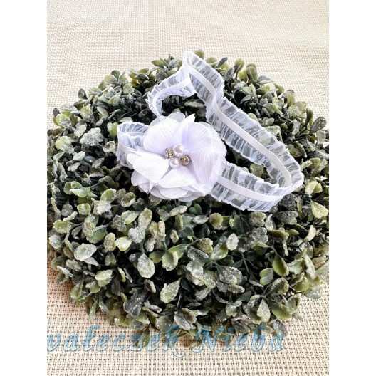 Urocza i miła w użytkowaniu opaska do chrztu uszyta z delikatnej, gumowanej tasiemki z organtynową falbanką oraz udekorowana przepięknym kwiatkiem z perłowo-diamenowym środeczkiem.